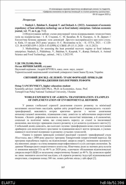 | Bibliographic citation (APA): | Yanchynskyy, O. (2025). Svitovyi dosvid "zelenoi" transformatsii: pryklady vprovadzhennia ekolohichnykh reform [World experience of «green» transformation: examples of implementation of environmental reforms]. Proceedings of the 6th International Scientific and Practical Conference „Digital economy as a factor of innovative and sustainable development of society“, 9-10 December 2025, Ternopil, 167-170. TNTU. [in Ukrainian]. |