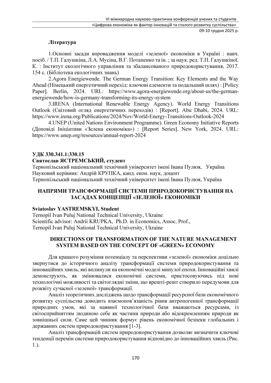 | Bibliographic citation (APA): | Yastremskyi, S. (2025). Napriamy transformatsii systemy pryrodokorystuvannia na zasadakh kontseptsii "zelenoi" ekonomiky [Directions of transformation of the nature management system based on the concept of «green» economy]. Proceedings of the 6th International Scientific and Practical Conference „Digital economy as a factor of innovative and sustainable development of society“, 9-10 December 2025, Ternopil, 170-172. TNTU. [in Ukrainian]. |