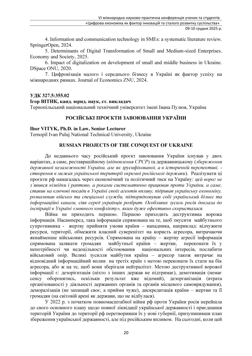 | Bibliographic citation (APA): | Vityk, I. (2025). Rosiiski proiekty zavoiuvannia Ukrainy [Russian projects of the conquest of Ukraine]. Proceedings of the 6th International Scientific and Practical Conference „Digital economy as a factor of innovative and sustainable development of society“, 9-10 December 2025, Ternopil, 20-22. TNTU. [in Ukrainian]. |