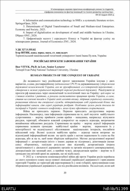 | Bibliographic citation (APA): | Vityk, I. (2025). Rosiiski proiekty zavoiuvannia Ukrainy [Russian projects of the conquest of Ukraine]. Proceedings of the 6th International Scientific and Practical Conference „Digital economy as a factor of innovative and sustainable development of society“, 9-10 December 2025, Ternopil, 20-22. TNTU. [in Ukrainian]. |