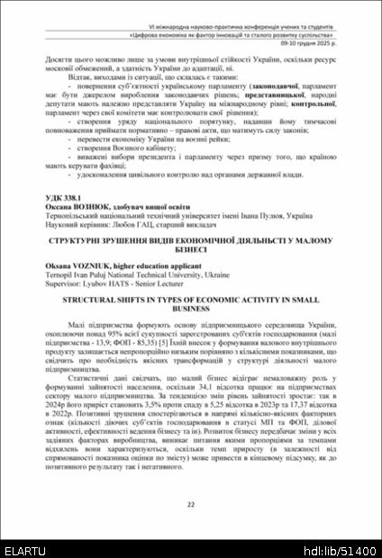| Bibliographic citation (APA): | Vozniuk, O. (2025). Strukturni zrushennia vydiv ekonomichnoi diialnosti u malomu biznesi [Structural shifts in types of economic activity in small business]. Proceedings of the 6th International Scientific and Practical Conference „Digital economy as a factor of innovative and sustainable development of society“, 9-10 December 2025, Ternopil, 22-25. TNTU. [in Ukrainian]. |