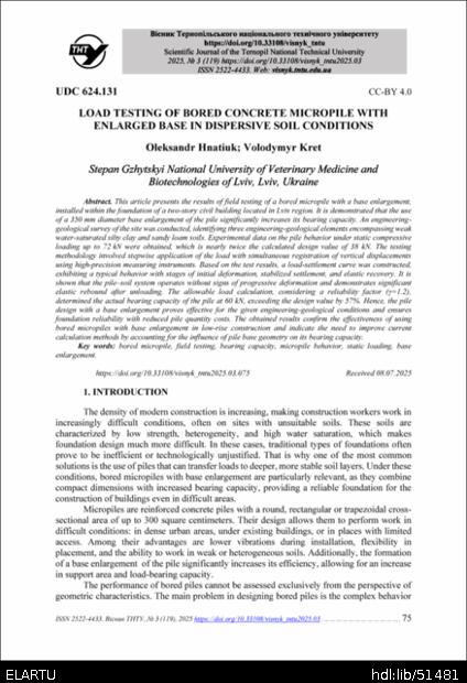 Bibliographic citation (APA): Hnatiuk, O., & Kret, V. (2025). Load testing of bored concrete micropile with enlarged base in dispersive soil conditions. Scientific Journal of the Ternopil National Technical University, 119(3), 75-82. TNTU..