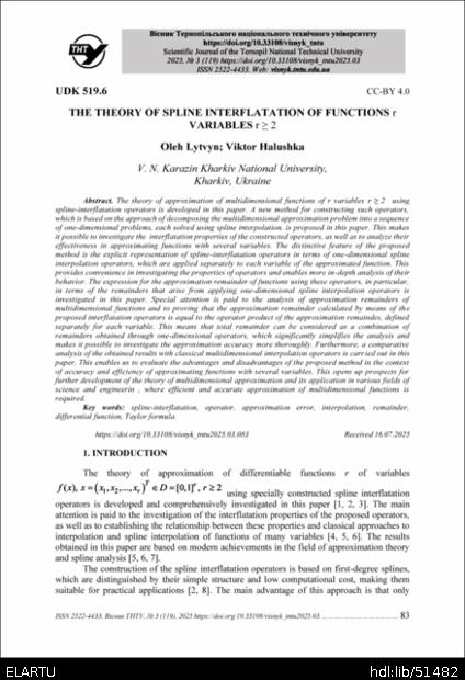 | Bibliographic citation (APA): | Lytvyn, O., & Halushka, V. (2025). The theory of spline interflatation of functions r variables r ≥ 2. Scientific Journal of the Ternopil National Technical University, 119(3), 83-96. TNTU.. |