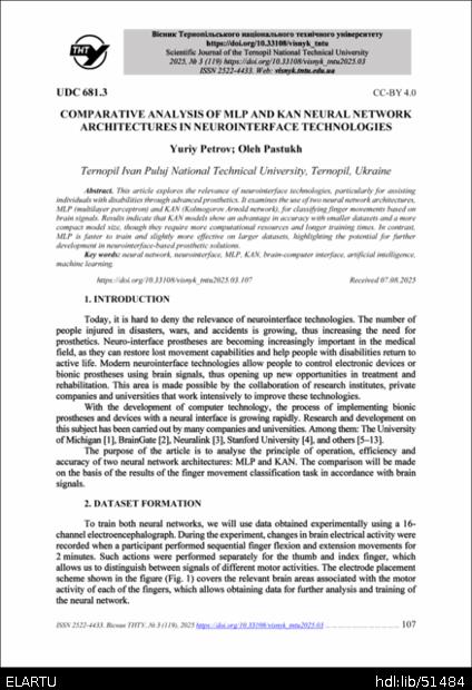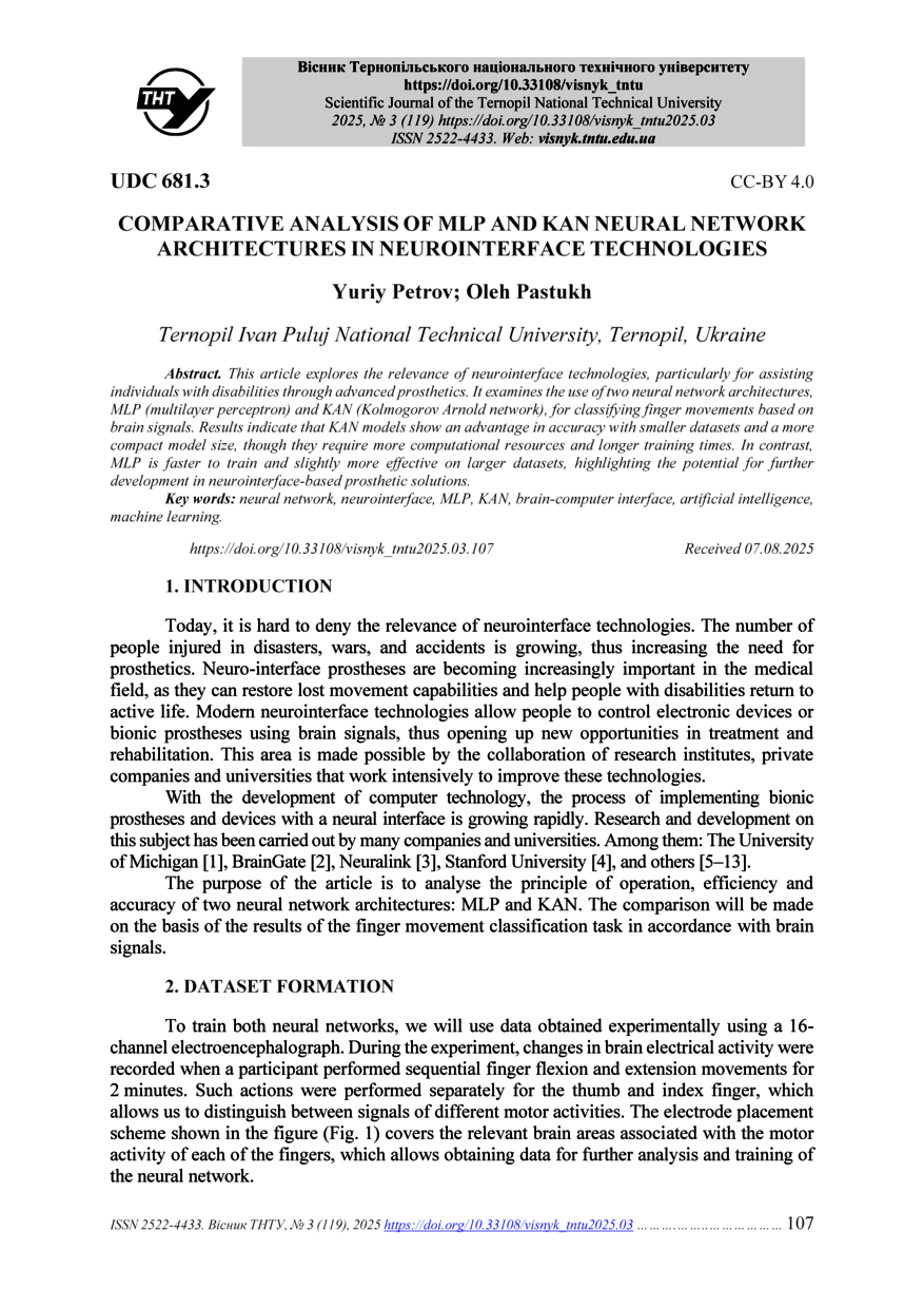 | Bibliographic citation (APA): | Petrov, Y., & Pastukh, O. (2025). Comparative analysis of MLP AND KAN neural network architectures in neurointerface technologies. Scientific Journal of the Ternopil National Technical University, 119(3), 107-114. TNTU.. |