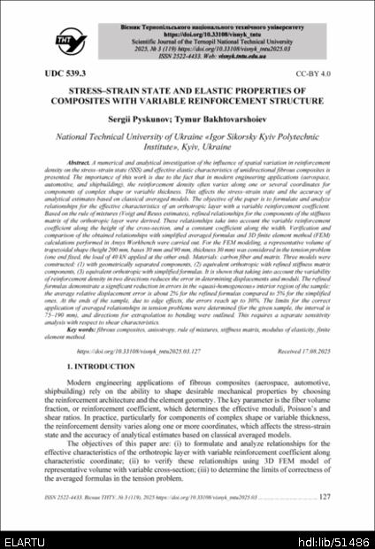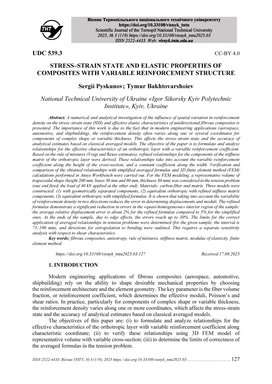 | Bibliographic citation (APA): | Pyskunov, S., & Bakhtovarshoiev, T. (2025). Stress–strain state and elastic properties of composites with variable reinforcement structure. Scientific Journal of the Ternopil National Technical University, 119(3), 127-133. TNTU.. |