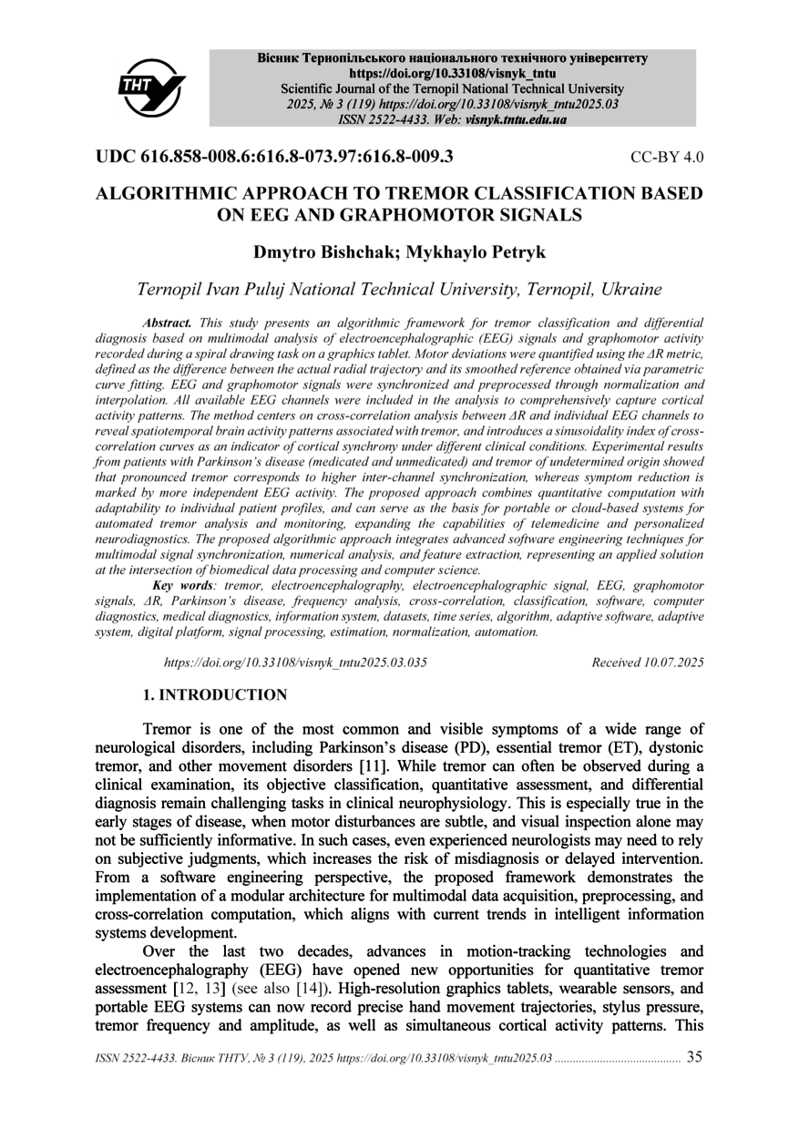 виділення ознак, що являє прикладне вирішення на перетині опрацювання біомедичних даних і комп’ютерних наук This study presents an algorithmic framework for tremor classification and differential diagnosis based on multimodal analysis of electroencephalographic (EEG) signals and graphomotor activity recorded during a spiral drawing task on a graphics tablet. Motor deviations were quantified using the ΔR metric, defined as the difference between the actual radial trajectory and its smoothed reference obtained via parametric curve fitting. EEG and graphomotor signals were synchronized and preprocessed through normalization and interpolation. All available EEG channels were included in the analysis to comprehensively capture cortical activity patterns. The method centers on cross-correlation analysis between ΔR and individual EEG channels to reveal spatiotemporal brain activity patterns associated with tremor, and introduces a sinusoidality index of cross- correlation curves as an indicator of cortical synchrony under different clinical conditions. Experimental results from patients with Parkinson’s disease (medicated and unmedicated) and tremor of undetermined origin showed that pronounced tremor corresponds to higher inter-channel synchronization, whereas symptom reduction is marked by more independent EEG activity. The proposed approach combines quantitative computation with adaptability to individual patient profiles, and can serve as the basis for portable or cloud-based systems for automated tremor analysis and monitoring, expanding the capabilities of telemedicine and personalized neurodiagnostics. The proposed algorithmic approach integrates advanced software engineering techniques for multimodal signal synchronization, numerical analysis, and feature extraction, representing an applied solution at the intersection of biomedical data processing and computer science |