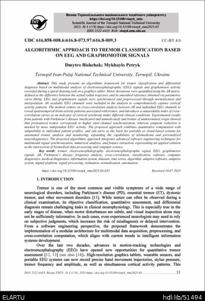 | Bibliographic citation (APA): | Bishchak, D., & Petryk, M. (2025). Algorithmic approach to tremor classification based on EEG and graphomotor signals. Scientific Journal of the Ternopil National Technical University, 119(3), 35-44. TNTU.. |