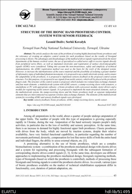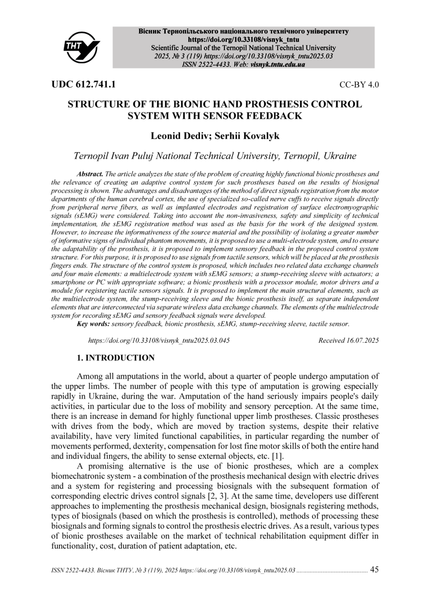| Bibliographic citation (APA): | Dediv, L., & Kovalyk, S. (2025). Structure of the bionic hand prosthesis control system with sensor feedback. Scientific Journal of the Ternopil National Technical University, 119(3), 45-55. TNTU.. |