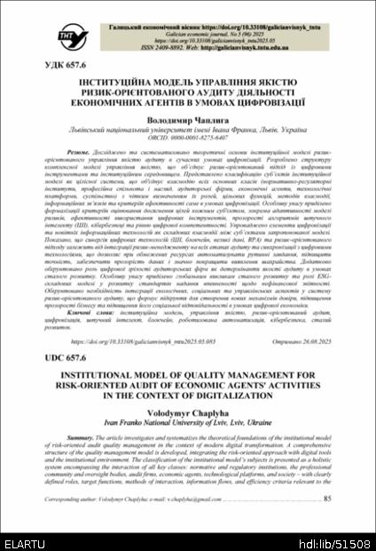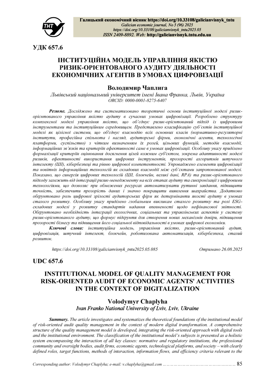 | Bibliographic citation (APA): | Chaplyha, V. (2025). Instytutsiina model upravlinnia yakistiu ryzyk-oriientovanoho audytu diialnosti ekonomichnykh ahentiv v umovakh tsyfrovizatsii [Institutional model of quality management for risk-oriented audit of economic agentsʼ activities in the context of digitalization]. Galician economic journal, 96(5), 85-94. TNTU. [in Ukrainian]. |