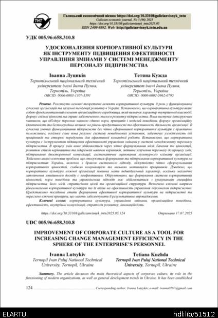 | Bibliographic citation (APA): | Lutsykiv, I., & Kuzhda, T. (2025). Udoskonalennia korporatyvnoi kultury yak instrumentu pidvyshchennia efektyvnosti upravlinnia zminamy u systemi menedzhmentu personalu pidpryiemstva [Improvement of corporate culture as a tool for increasing change management efficiency in the sphere of the enterprise’s personnel]. Galician economic journal, 96(5), 124-133. TNTU. [in Ukrainian]. |