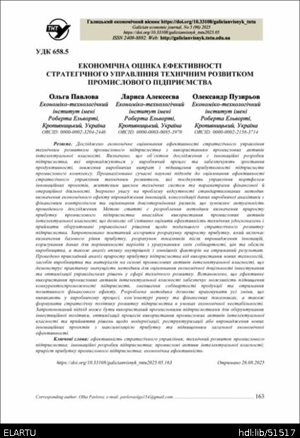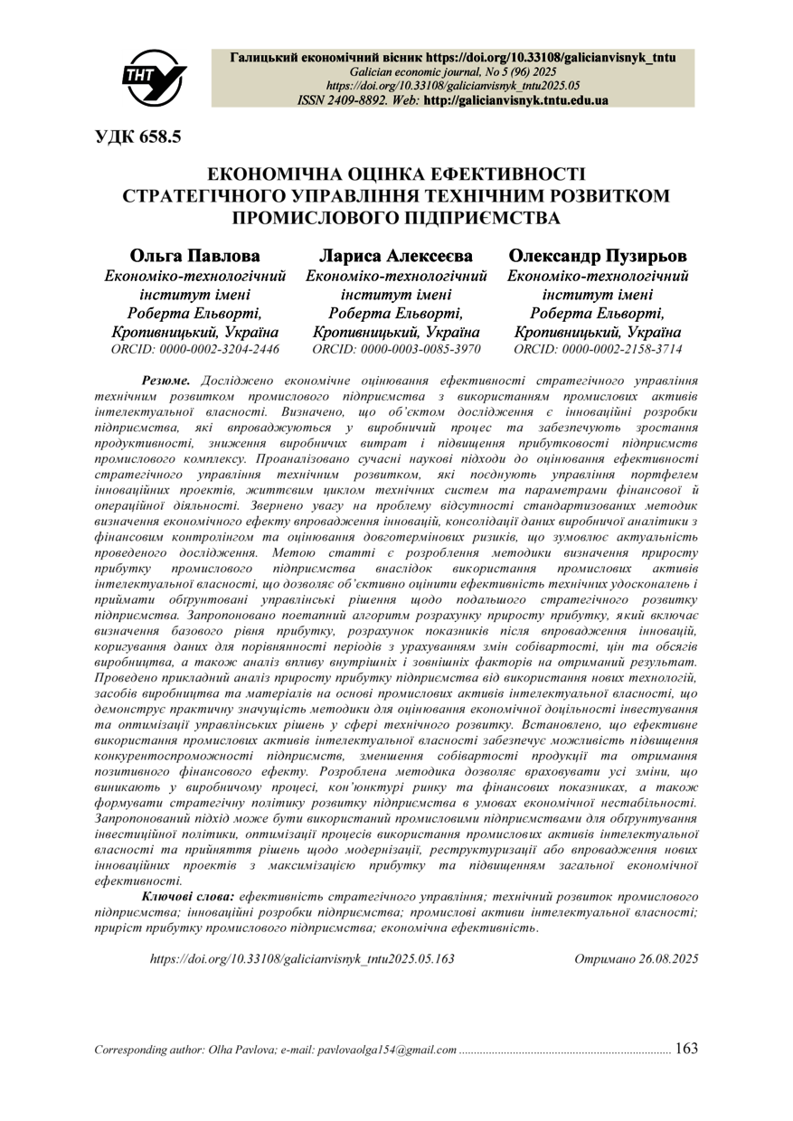 | Bibliographic citation (APA): | Pavlova, O., Alekseieva, L., & Puzyriov, O. (2025). Ekonomichna otsinka efektyvnosti stratehichnoho upravlinnia tekhnichnym rozvytkom promyslovoho pidpryiemstva [Economic evaluation of the efficiency of strategic management of technical development in an industrial enterprise]. Galician economic journal, 96(5), 163-169. TNTU. [in Ukrainian]. |