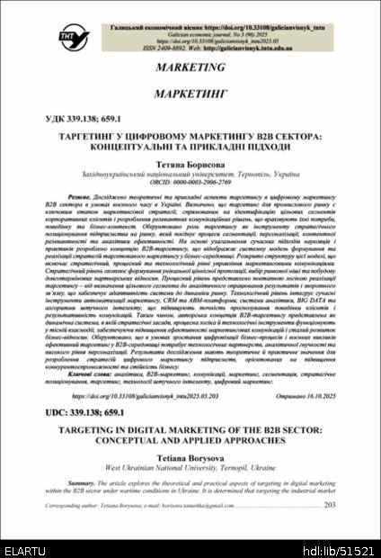 | Bibliographic citation (APA): | Borysova, T. (2025). Tarhetynh u tsyfrovomu marketynhu b2b sektora: kontseptualni ta prykladni pidkhody [Targeting in digital marketing of the b2b sector: conceptual and applied approaches]. Galician economic journal, 96(5), 203-214. TNTU. [in Ukrainian]. |