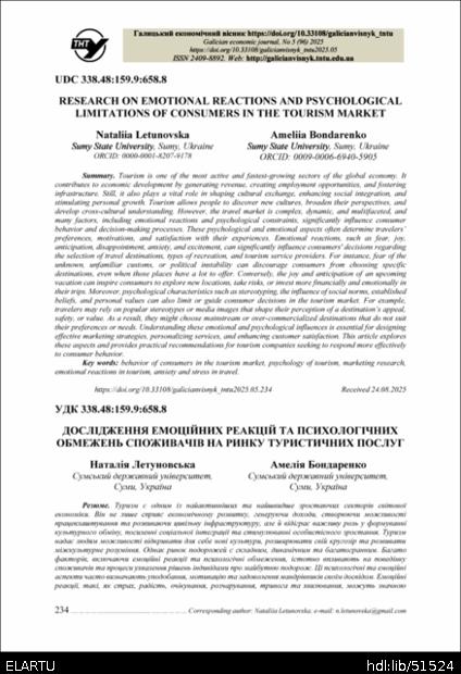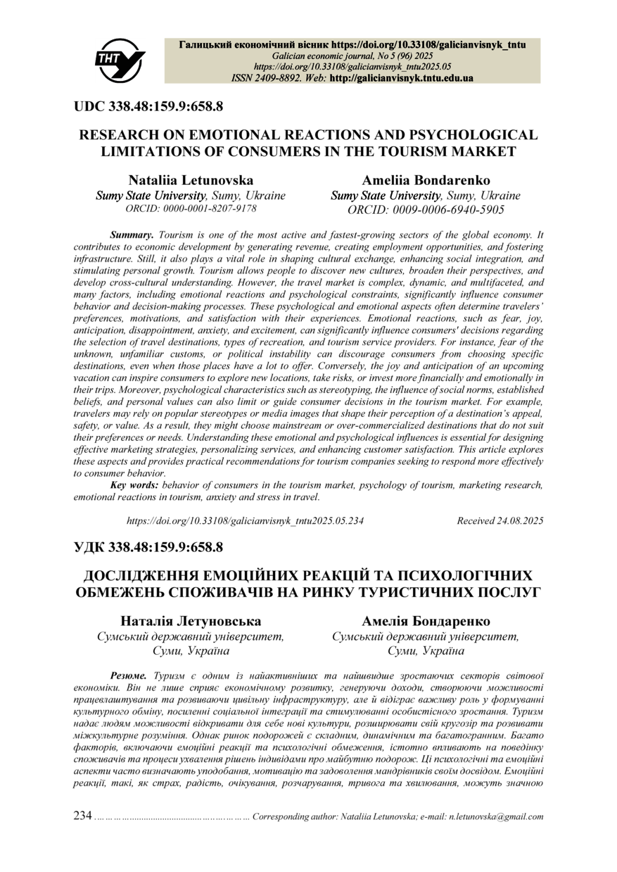 | Bibliographic citation (APA): | Letunovska, N., & Bondarenko, A. (2025). Doslidzhennia emotsiinykh reaktsii ta psykholohichnykh obmezhen spozhyvachiv na rynku turystychnykh posluh [Research on emotional reactions and psychological limitations of consumers in the tourism market]. Galician economic journal, 96(5), 234-240. TNTU. [in Ukrainian]. |