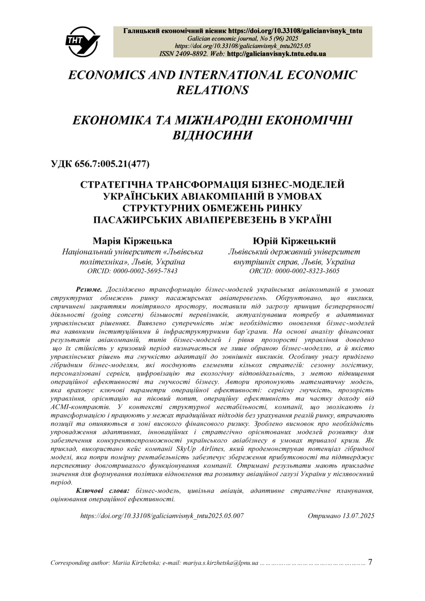 | Bibliographic citation (APA): | Kirzhetska, M., & Kirzhetskyy, Y. (2025). Stratehichna transformatsiia biznes-modelei ukrainskykh aviakompanii v umovakh strukturnykh obmezhen rynku pasazhyrskykh aviaperevezen v Ukraini [Strategic transformation of business models of ukrainian airlines under structural constraints of the passenger air transportation market in Ukraine]. Galician economic journal, 96(5), 7-14. TNTU. [in Ukrainian]. |