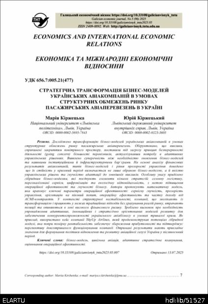 | Bibliographic citation (CHICAGO): | Kirzhetska M., Kirzhetskyy Y. (2025) Stratehichna transformatsiia biznes-modelei ukrainskykh aviakompanii v umovakh strukturnykh obmezhen rynku pasazhyrskykh aviaperevezen v Ukraini [Strategic transformation of business models of ukrainian airlines under structural constraints of the passenger air transportation market in Ukraine]. Galician economic journal (Tern.), vol. 96, no 5, pp. 7-14 [in Ukrainian]. |