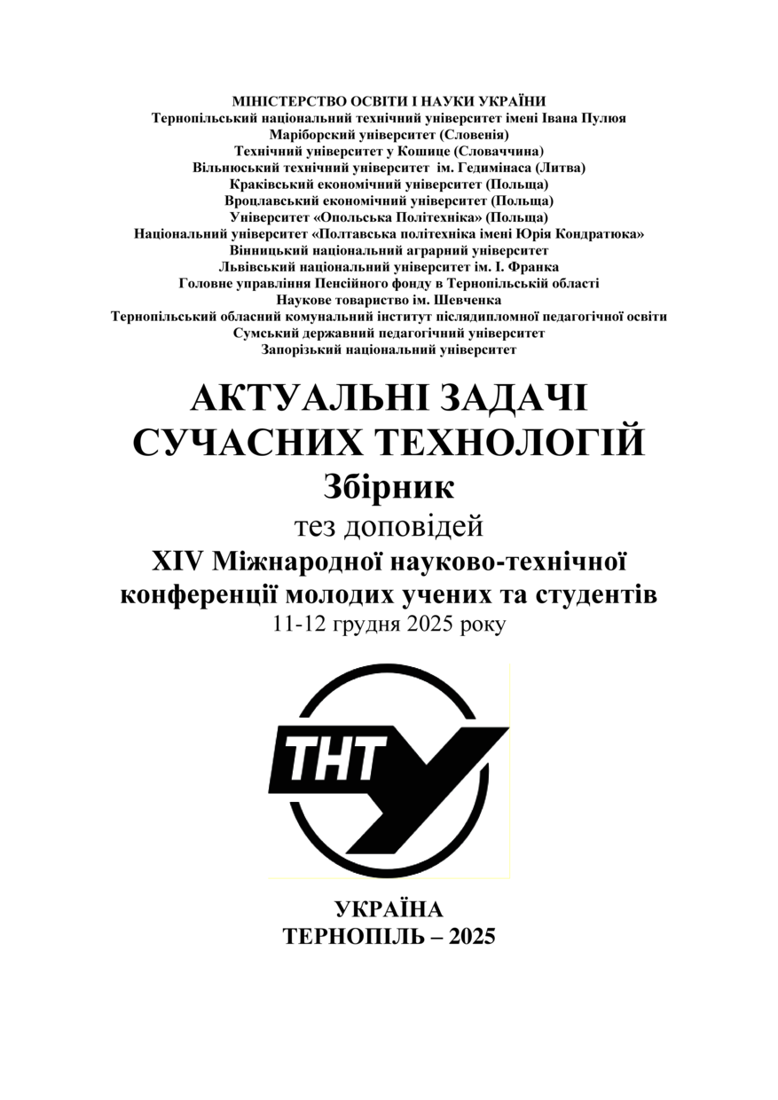 | Є частиною видання: | Матеріали ⅩⅣ Міжнародної науково-технічної конференції молодих учених та студентів „Актуальні задачі сучасних технологій“, 2025 Proceedings of the ⅩⅣ International Scientific and Technical Conference of Young Scientists and Students “Current Issues of Modern Technologies”, 2025 |