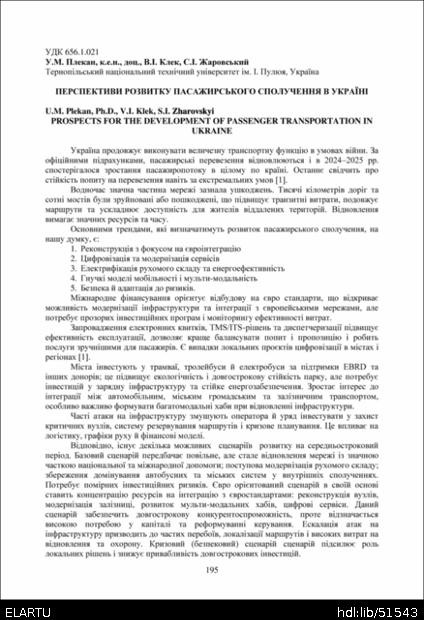 Bibliographic citation (APA): Plekan, U. M., Klek, V. I., & Zharovskyi, S. I. (2025). Perspektyvy rozvytku pasazhyrskoho spoluchennia v Ukraini [Prospects for the development of passenger transportation in Ukraine]. Proceedings of the ⅩⅣ International Scientific and Technical Conference of Young Scientists and Students “Current Issues of Modern Technologies”, 11-12 December 2025, Ternopil, 195-196. PE Palianytsia V.A.. [in Ukrainian].