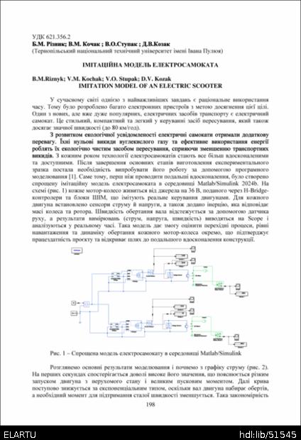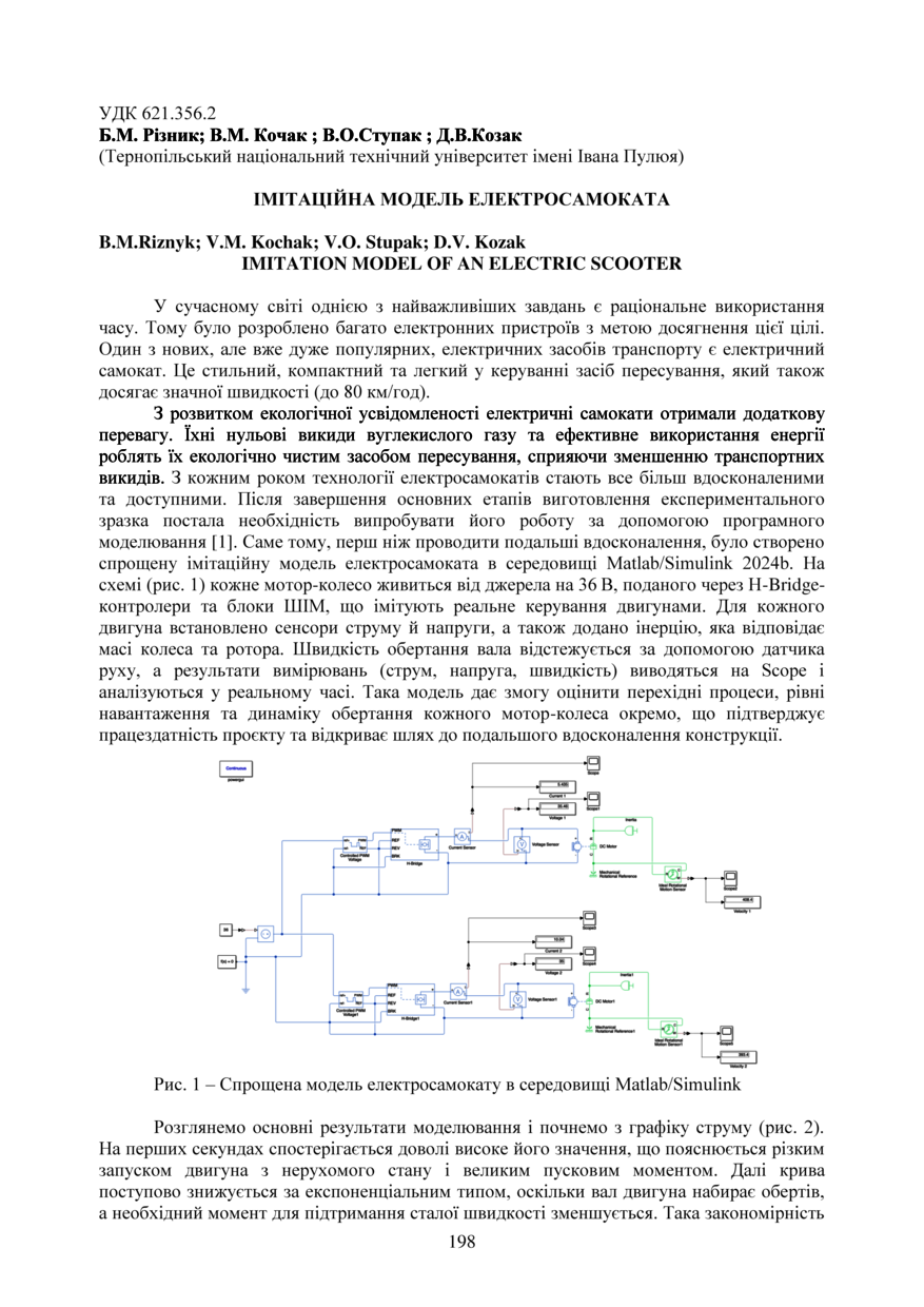 | Bibliographic citation (APA): | Riznyk, B. M., Kochak, V. M., Stupak, V. O., & Kozak, D. V. (2025). Imitatsiina model elektrosamokata [Imitation model of an electric scooter]. Proceedings of the ⅩⅣ International Scientific and Technical Conference of Young Scientists and Students “Current Issues of Modern Technologies”, 11-12 December 2025, Ternopil, 198-199. PE Palianytsia V.A.. [in Ukrainian]. |