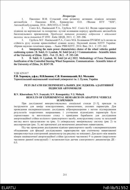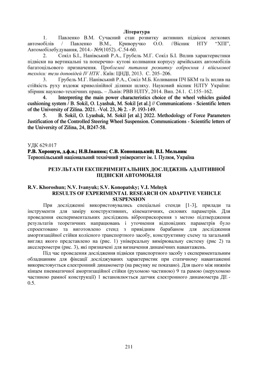 | Bibliographic citation (APA): | Khoroshun, R. V., Ivanyuk, N. V., Konopatsky, S. V., & Melnyk, V. I. (2025). Rezultaty eksperymentalnykh doslidzhen adaptyvnoi pidvisky avtomobilia [Results of experimental research on adaptive vehicle suspension]. Proceedings of the ⅩⅣ International Scientific and Technical Conference of Young Scientists and Students “Current Issues of Modern Technologies”, 11-12 December 2025, Ternopil, 211-213. PE Palianytsia V.A.. [in Ukrainian]. |