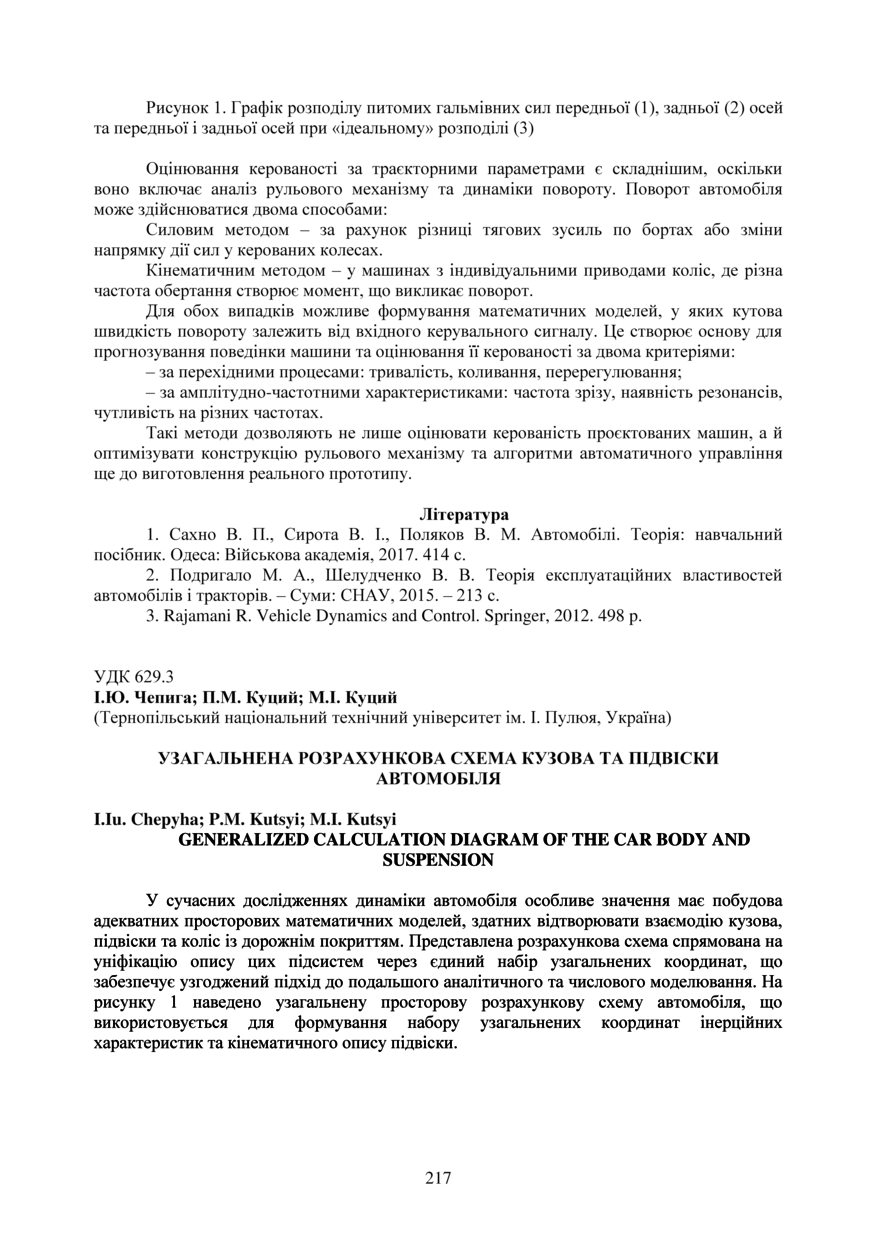 Bibliographic citation (CHICAGO): Chepyha I. Iu., Kutsyi P. M., Kutsyi M. I. (2025) Uzahalnena rozrakhunkova skhema kuzova ta pidvisky avtomobilia [Generalized calculation diagram of the car body and suspension]. Proceedings of the ⅩⅣ International Scientific and Technical Conference of Young Scientists and Students “Current Issues of Modern Technologies” (Tern., 11-12 December 2025), pp. 217-218 [in Ukrainian].