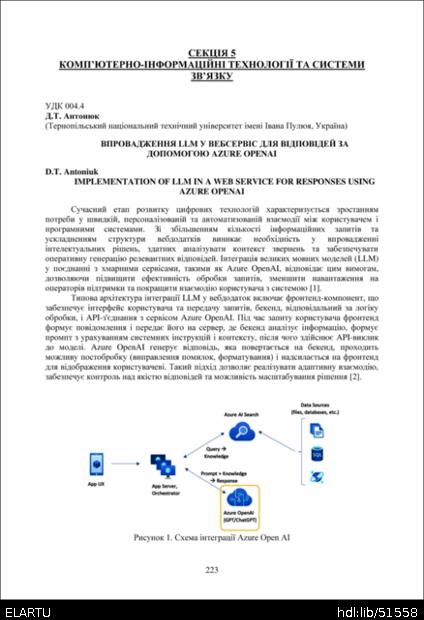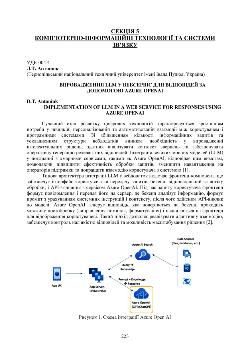 | Bibliographic citation (APA): | Antoniuk, D. T. (2025). Vprovadzhennia LLM u vebservis dlia vidpovidei za dopomohoiu Azure OpenAI [Implementation of LLM in a web service for responses using Azure OpenAI]. Proceedings of the ⅩⅣ International Scientific and Technical Conference of Young Scientists and Students “Current Issues of Modern Technologies”, 11-12 December 2025, Ternopil, 223-224. PE Palianytsia V.A.. [in Ukrainian]. |
