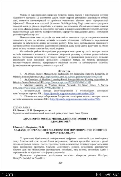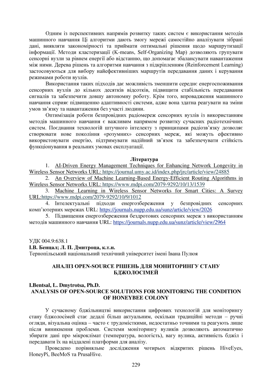 Bibliographic citation (APA): Bentsal, I., & Dmytrotsa, L. (2025). Analiz Open‑source rishen dlia monytorynhu stanu bdzholosimei [Analysis of Open‑source solutions for monitoring the condition of honeybee colony]. Proceedings of the ⅩⅣ International Scientific and Technical Conference of Young Scientists and Students “Current Issues of Modern Technologies”, 11-12 December 2025, Ternopil, 229-230. PE Palianytsia V.A.. [in Ukrainian].
