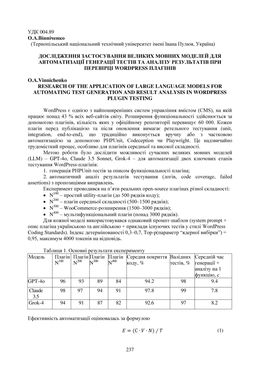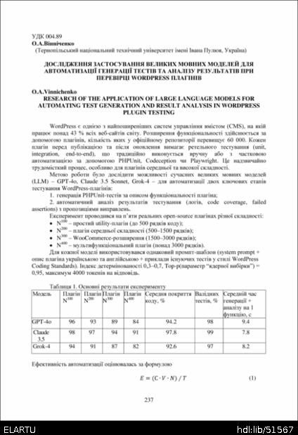 | Bibliographic reference (2015): | Вінніченко О. А. Дослідження застосування великих мовних моделей для автоматизації генерації тестів та аналізу результатів при перевірці wordpress плагінів // Матеріали ⅩⅣ МНТКМУС „Актуальні задачі сучасних технологій“, Тернопіль, 11-12 грудня 2025. 2025. С. 237–239. |