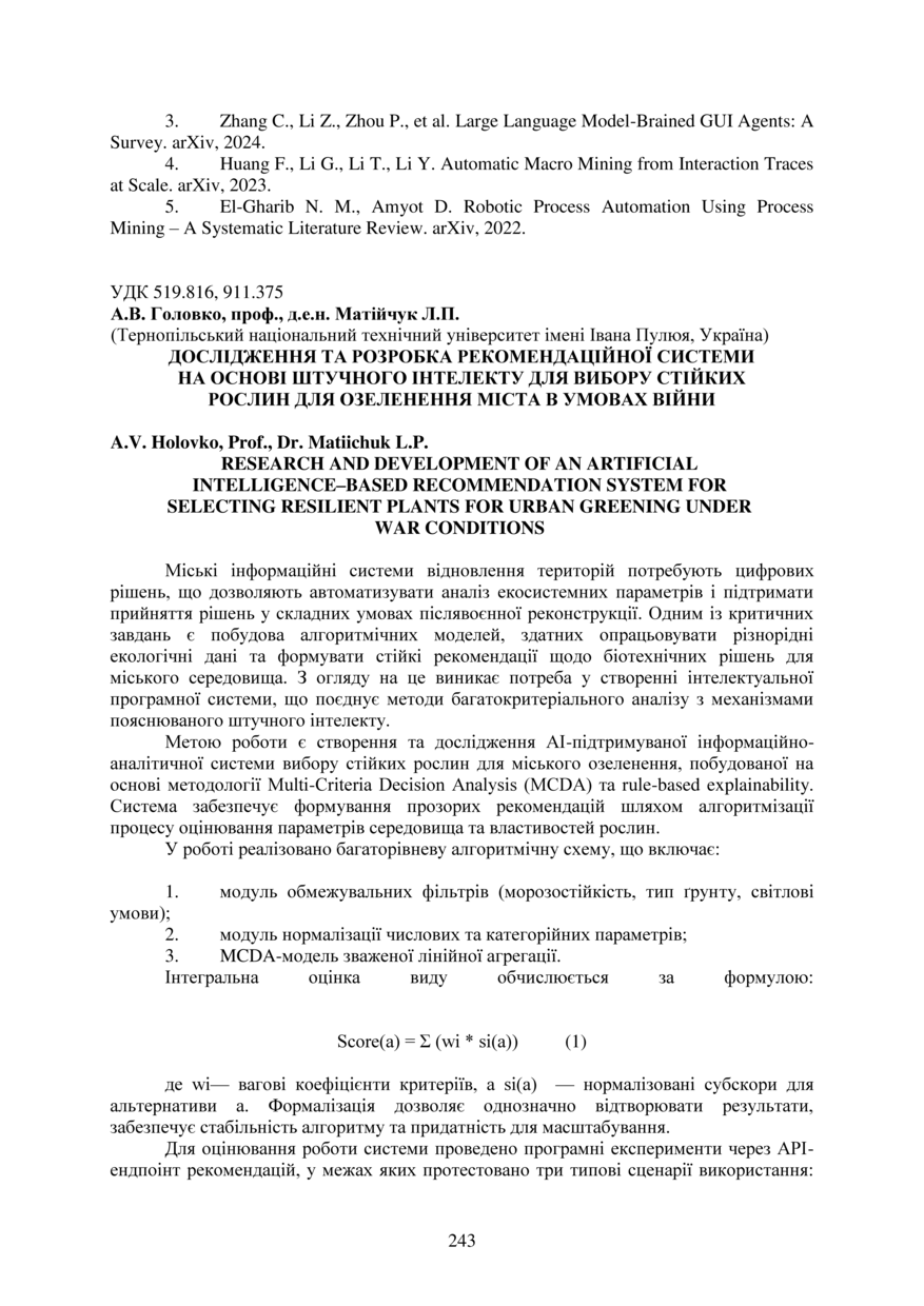 Bibliographic citation (APA): Holovko, A. V., & Matiichuk, L. P. (2025). Doslidzhennia ta rozrobka rekomendatsiinoi systemy na osnovi shtuchnoho intelektu dlia vyboru stiikykh roslyn dlia ozelenennia mista v umovakh viiny [Research and development of an artificial intelligence–based recommendation system for selecting resilient plants for urban greening under war conditions]. Proceedings of the ⅩⅣ International Scientific and Technical Conference of Young Scientists and Students “Current Issues of Modern Technologies”, 11-12 December 2025, Ternopil, 243-244. PE Palianytsia V.A.. [in Ukrainian].