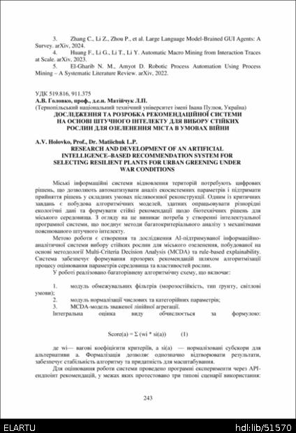 Bibliographic description (Ukraine): Головко А. В. Дослідження та розробка рекомендаційної системи на основі штучного інтелекту для вибору стійких рослин для озеленення міста в умовах війни / А. В. Головко, Л. П. Матійчук // Матеріали ⅩⅣ МНТКМУС „Актуальні задачі сучасних технологій“, 11-12 грудня 2025. — Т. : ФОП Паляниця В.А., 2025. — С. 243–244. — (Комп’ютерно-інформаційні технології та системи зв’язку).