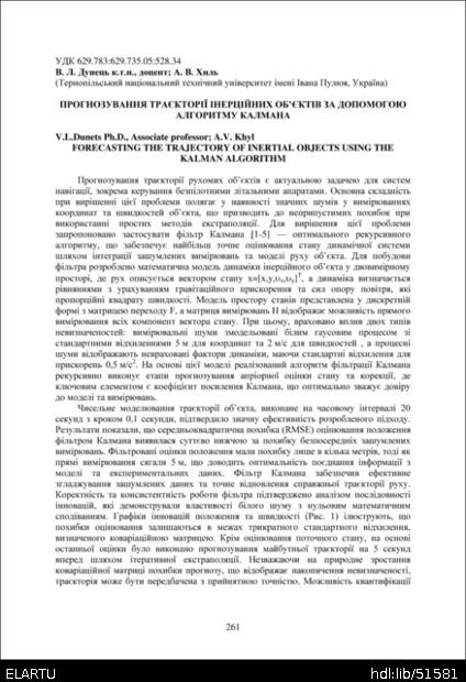 Bibliographic reference (2015): Дунець В. Л., Хиль А. В. Прогнозування траєкторії інерційних об’єктів за допомогою алгоритму калмана // Матеріали ⅩⅣ МНТКМУС „Актуальні задачі сучасних технологій“, Тернопіль, 11-12 грудня 2025. 2025. С. 261–263.