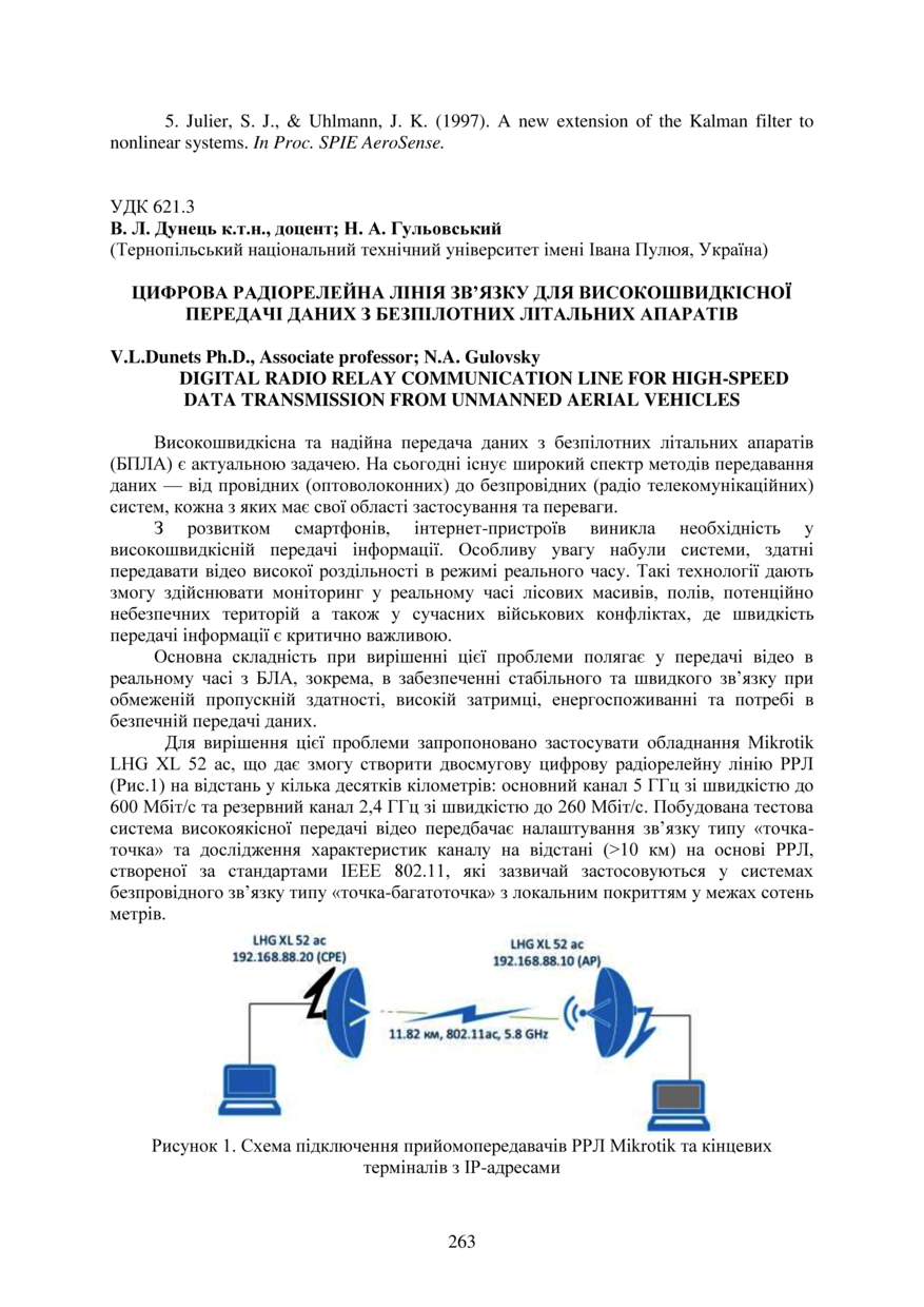 Bibliographic citation (APA): Dunets, V. L., & Gulovsky, N. A. (2025). Tsyfrova radioreleina liniia zviazku dlia vysokoshvydkisnoi peredachi danykh z bezpilotnykh litalnykh aparativ [Digital radio relay communication line for high-speed data transmission from unmanned aerial vehicles]. Proceedings of the ⅩⅣ International Scientific and Technical Conference of Young Scientists and Students “Current Issues of Modern Technologies”, 11-12 December 2025, Ternopil, 263-264. PE Palianytsia V.A.. [in Ukrainian].