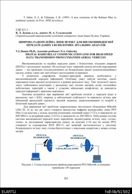 Bibliographic reference (2015): Дунець В. Л., Гульовський Н. А. Цифрова радіорелейна лінія зв’язку для високошвидкісної передачі даних з безпілотних літальних апаратів // Матеріали ⅩⅣ МНТКМУС „Актуальні задачі сучасних технологій“, Тернопіль, 11-12 грудня 2025. 2025. С. 263–264.