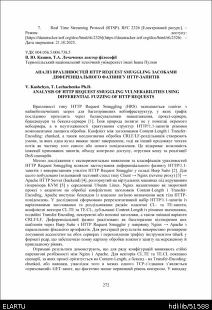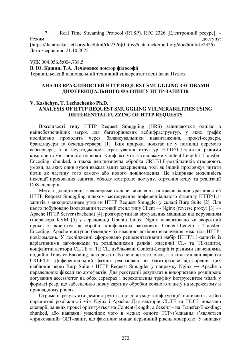 Бібліографічний опис: Кащин В. Ю. Аналіз вразливостей http request smuggling засобами диференціального фаззингу http-запитів / В. Ю. Кащин, Тарас Анатолійович Лечаченко // Матеріали ⅩⅣ МНТКМУС „Актуальні задачі сучасних технологій“, 11-12 грудня 2025. — Т. : ФОП Паляниця В.А., 2025. — С. 272–273. — (Комп’ютерно-інформаційні технології та системи зв’язку).