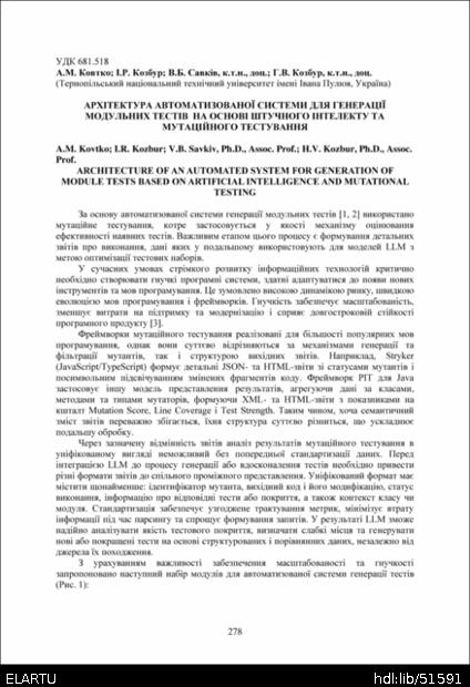 Бібліографічний опис: Архітектура автоматизованої системи для генерації модульних тестів на основі штучного інтелекту та мутаційного тестування / А. М. Ковтко, І. Р. Козбур, Володимир Богданович Савків, Галина Володимирівна Козбур // Матеріали ⅩⅣ МНТКМУС „Актуальні задачі сучасних технологій“, 11-12 грудня 2025. — Т. : ФОП Паляниця В.А., 2025. — С. 278–280. — (Комп’ютерно-інформаційні технології та системи зв’язку).