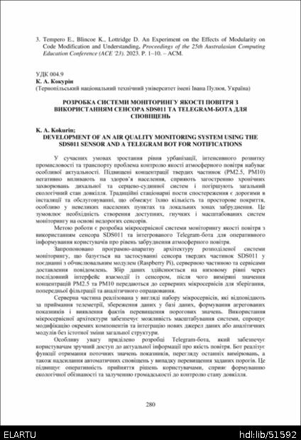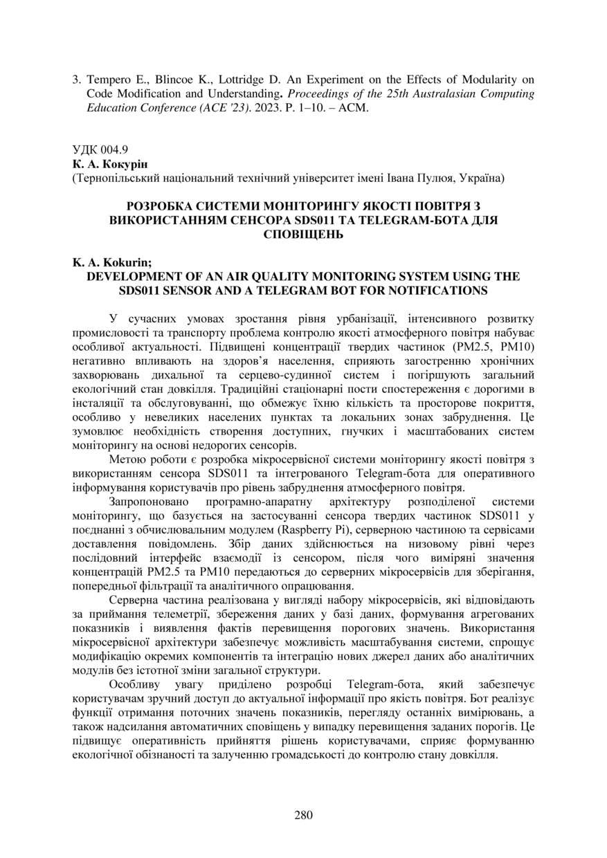 | Bibliographic reference (2015): | Кокурін К. А. Розробка системи моніторингу якості повітря з використанням сенсора SDS011 та telegram-бота для сповіщень // Матеріали ⅩⅣ МНТКМУС „Актуальні задачі сучасних технологій“, Тернопіль, 11-12 грудня 2025. 2025. С. 280–282. |