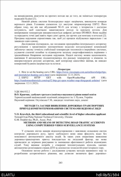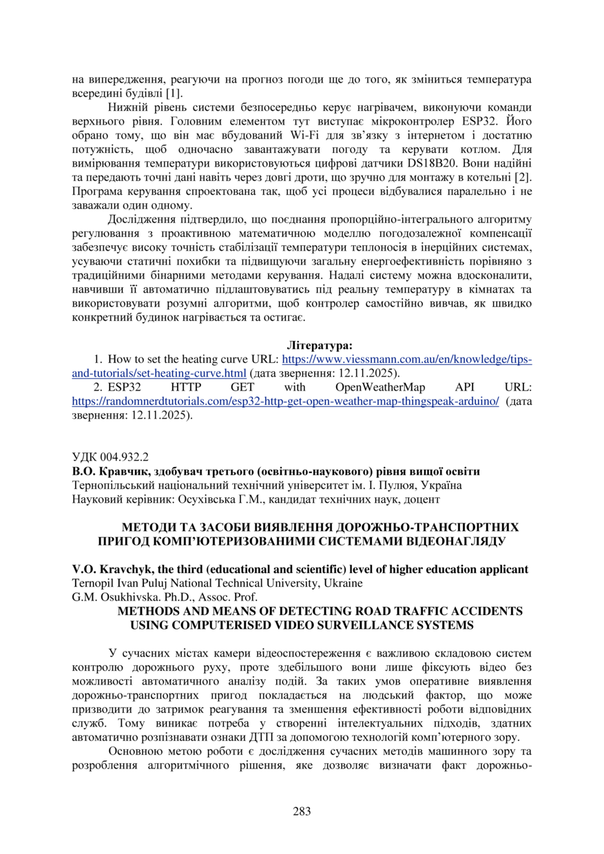 | Bibliographic citation (APA): | Kravchyk, V. O. (2025). Metody ta zasoby vyiavlennia dorozhno-transportnykh pryhod kompiuteryzovanymy systemamy videonahliadu [Methods and means of detecting road traffic accidents using computerised video surveillance systems]. Proceedings of the ⅩⅣ International Scientific and Technical Conference of Young Scientists and Students “Current Issues of Modern Technologies”, 11-12 December 2025, Ternopil, 283-284. PE Palianytsia V.A.. [in Ukrainian]. |
