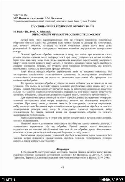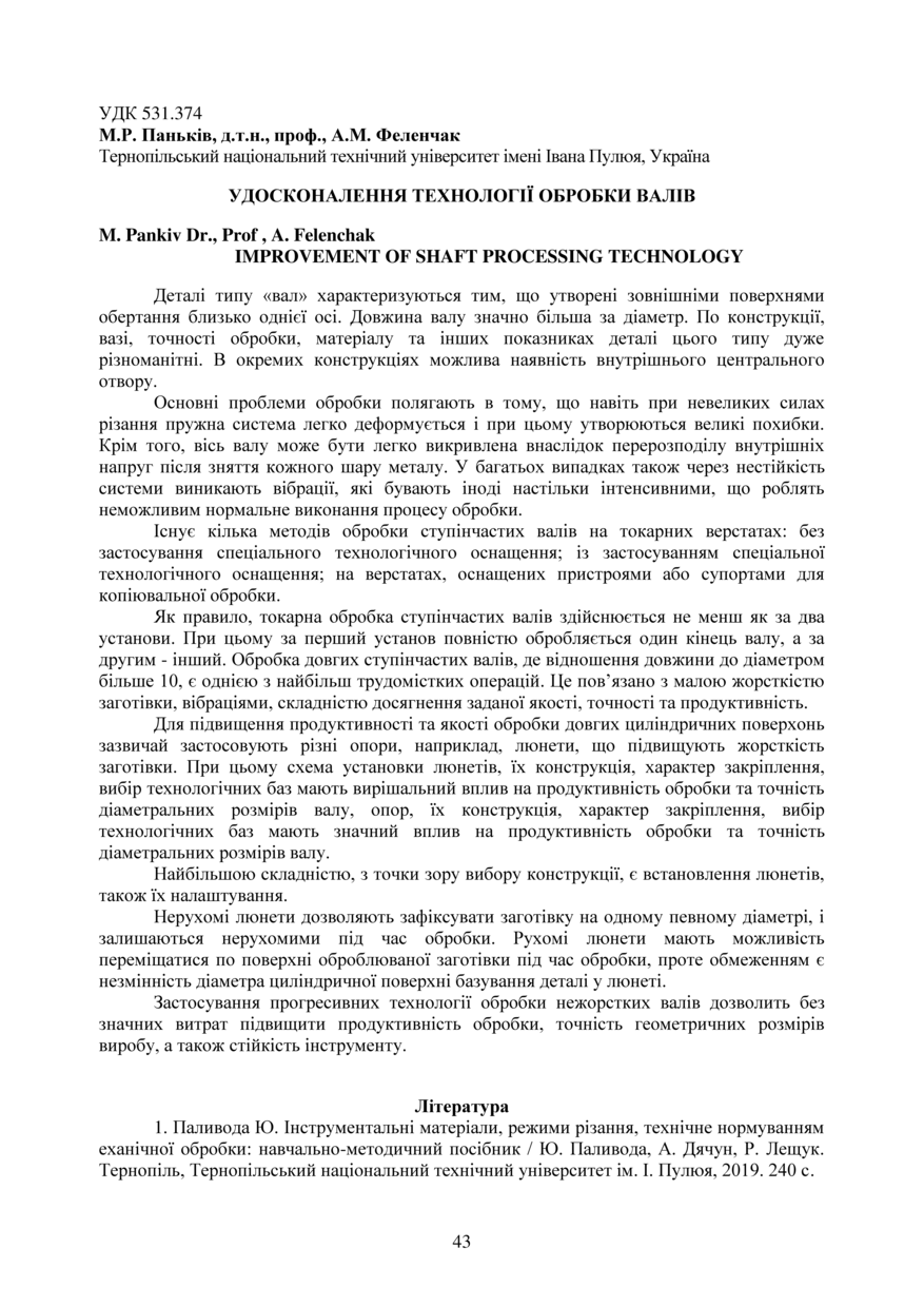 | Bibliographic reference (2015): | Паньків М. Р., Феленчак А. М. Удосконалення технології обробки валів // Матеріали ⅩⅣ МНТКМУС „Актуальні задачі сучасних технологій“, Тернопіль, 11-12 грудня 2025. 2025. С. 43. |