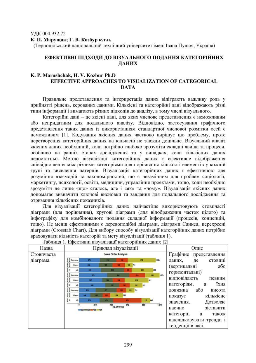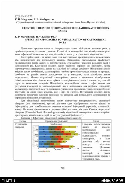 | Bibliographic citation (APA): | Marushchak, K. P., & Kozbur, H. V. (2025). Efektyvni pidkhody do vizualnoho podannia katehoriinykh danykh [Effective approaches to visualization of categorical data]. Proceedings of the ⅩⅣ International Scientific and Technical Conference of Young Scientists and Students “Current Issues of Modern Technologies”, 11-12 December 2025, Ternopil, 299-300. PE Palianytsia V.A.. [in Ukrainian]. |