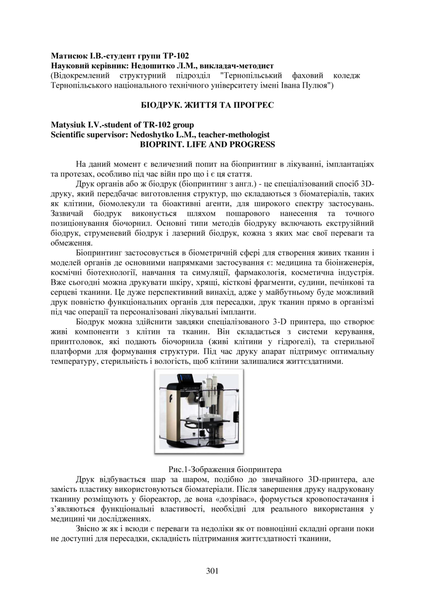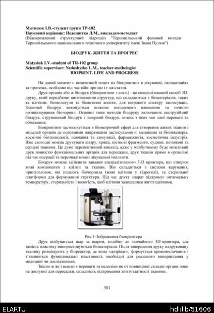 | Bibliographic reference (2015): | Матисюк І. В. Біодрук. життя та прогрес // Матеріали ⅩⅣ МНТКМУС „Актуальні задачі сучасних технологій“, Тернопіль, 11-12 грудня 2025. 2025. С. 301–302. |