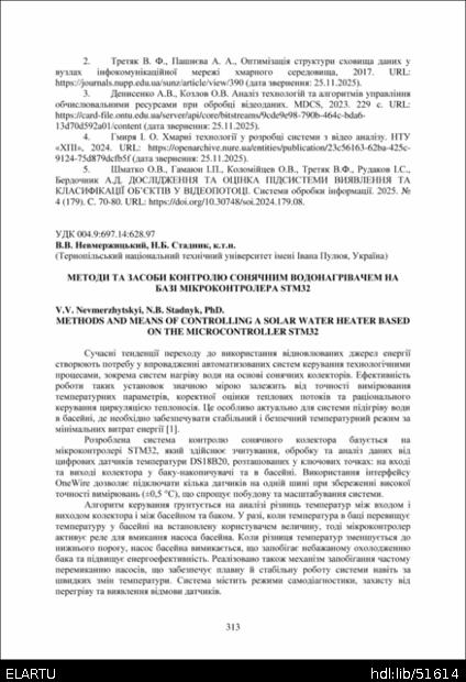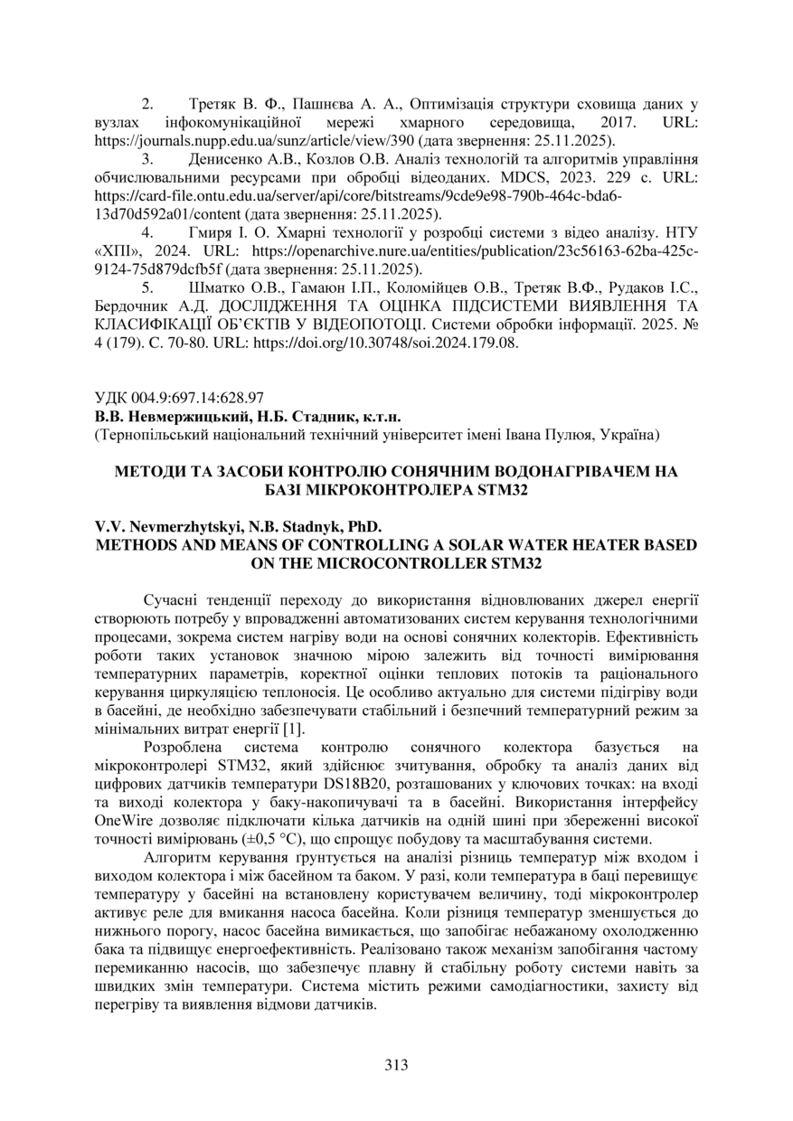 Bibliographic reference (2015): Невмержицький В. В., Стадник Н. Б. Методи та засоби контролю сонячним водонагрівачем на базі мікроконтролера STM32 // Матеріали ⅩⅣ МНТКМУС „Актуальні задачі сучасних технологій“, Тернопіль, 11-12 грудня 2025. 2025. С. 313–314.