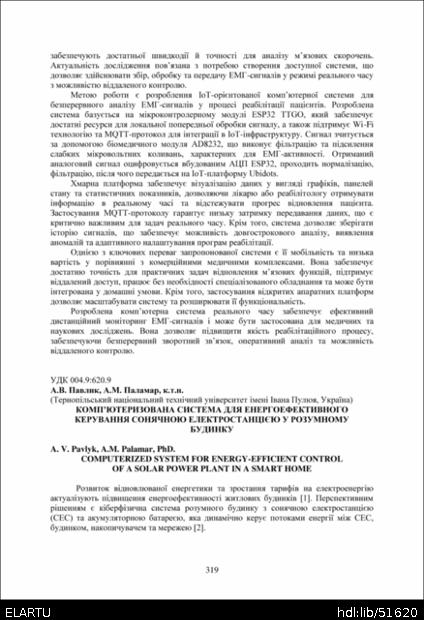 | Bibliographic reference (2015): | Павлик А. В., Паламар А. М. Комп’ютеризована система для енергоефективного керування сонячною електростанцією у розумному будинку // Матеріали ⅩⅣ МНТКМУС „Актуальні задачі сучасних технологій“, Тернопіль, 11-12 грудня 2025. 2025. С. 319–320. |