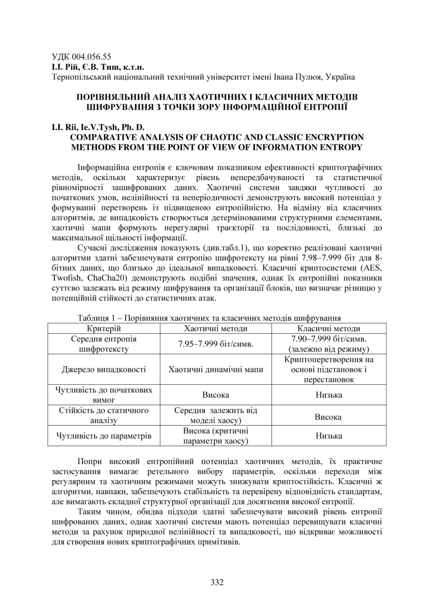 | Bibliographic citation (APA): | Rii, I. I., & Tysh, Ie. V. (2025). Porivnialnyi analiz khaotychnykh i klasychnykh metodiv shyfruvannia z tochky zoru informatsiinoi entropii [Comparative analysis of chaotic and classic encryption methods from the point of view of information entropy]. Proceedings of the ⅩⅣ International Scientific and Technical Conference of Young Scientists and Students “Current Issues of Modern Technologies”, 11-12 December 2025, Ternopil, 332. PE Palianytsia V.A.. [in Ukrainian]. |