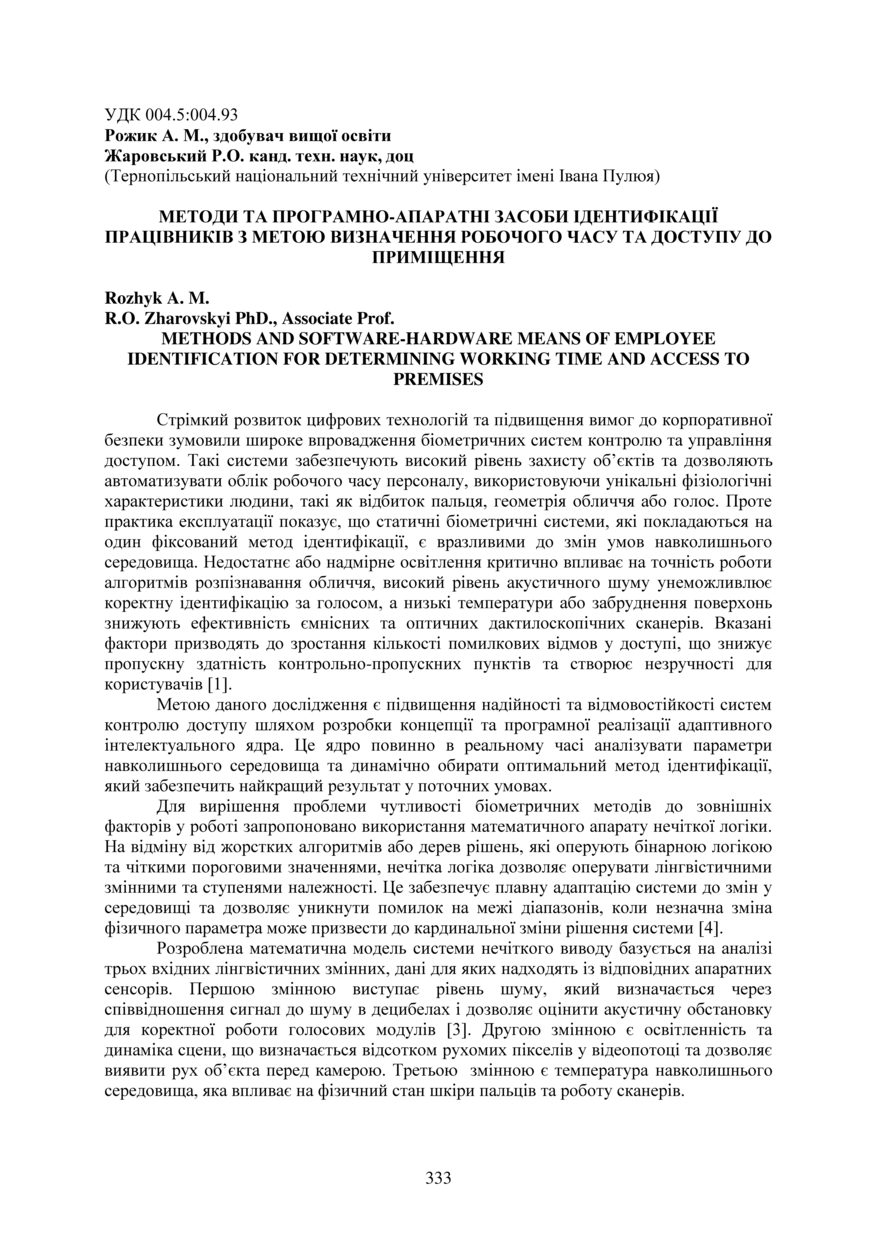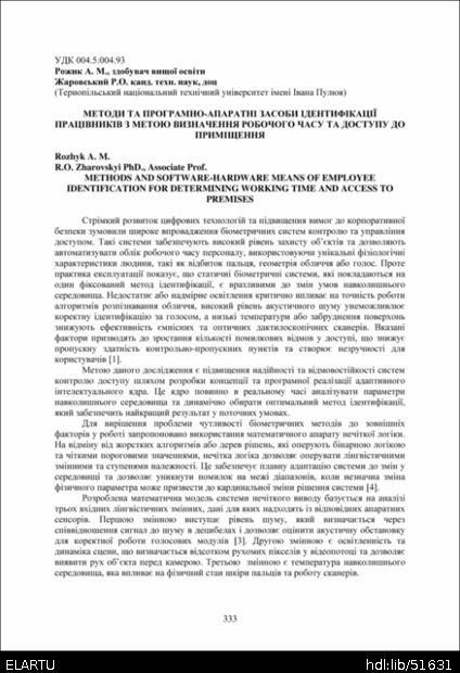 | Bibliographic reference (2015): | Рожик А. М., Жаровський Р. О. Методи та програмно-апаратні засоби ідентифікації працівників з метою визначення робочого часу та доступу до приміщення // Матеріали ⅩⅣ МНТКМУС „Актуальні задачі сучасних технологій“, Тернопіль, 11-12 грудня 2025. 2025. С. 333–335. |