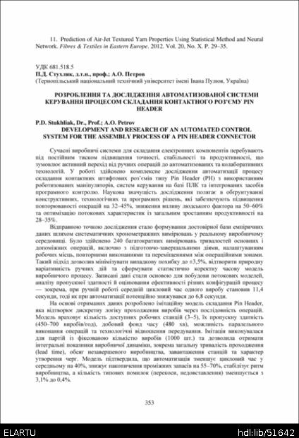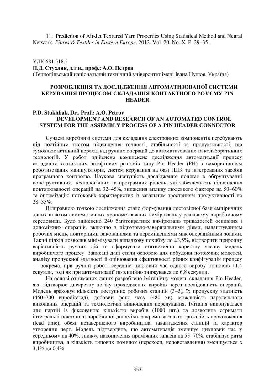 | Bibliographic reference (2015): | Стухляк П. Д., Петров А. О. Розроблення та дослідження автоматизованої системи керування процесом складання контактного роз’єму Pin Header // Матеріали ⅩⅣ МНТКМУС „Актуальні задачі сучасних технологій“, Тернопіль, 11-12 грудня 2025. 2025. С. 353–355. |