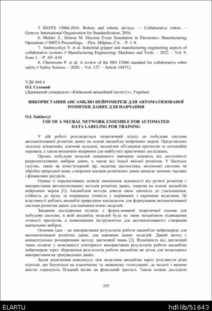 | Bibliographic citation (APA): | Sukhovyi, O. I. (2025). Vykorystannia ansambliu neiromerezh dlia avtomatyzovanoi rozmitky danykh dlia navchannia [Use of a neural network ensemble for automated data labeling for training]. Proceedings of the ⅩⅣ International Scientific and Technical Conference of Young Scientists and Students “Current Issues of Modern Technologies”, 11-12 December 2025, Ternopil, 355-356. PE Palianytsia V.A.. [in Ukrainian]. |