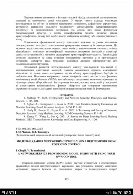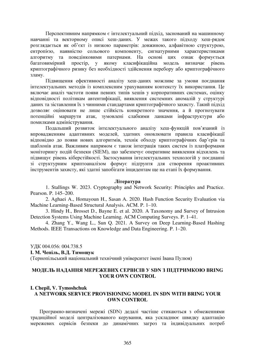 Бібліографічний опис: Чепіль І. М. Модель надання мережевих сервісів у SDN з підтримкою Bring Your Own Control / І. М. Чепіль, В. Д. Тимощук // Матеріали ⅩⅣ МНТКМУС „Актуальні задачі сучасних технологій“, 11-12 грудня 2025. — Т. : ФОП Паляниця В.А., 2025. — С. 365–366. — (Комп’ютерно-інформаційні технології та системи зв’язку).