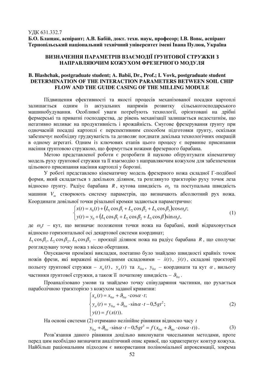 Bibliographic citation (CHICAGO): Blashchak B., Babii A., Vovk I. (2025) Vyznachennia parametriv vzaiemodii gruntovoi struzhky z napravliaiuchym kozhukhom frezernoho modulia [Determination of the interaction parameters between soil chip flow and the guide casing of the milling module]. Proceedings of the ⅩⅣ International Scientific and Technical Conference of Young Scientists and Students “Current Issues of Modern Technologies” (Tern., 11-12 December 2025), pp. 52-54 [in Ukrainian].