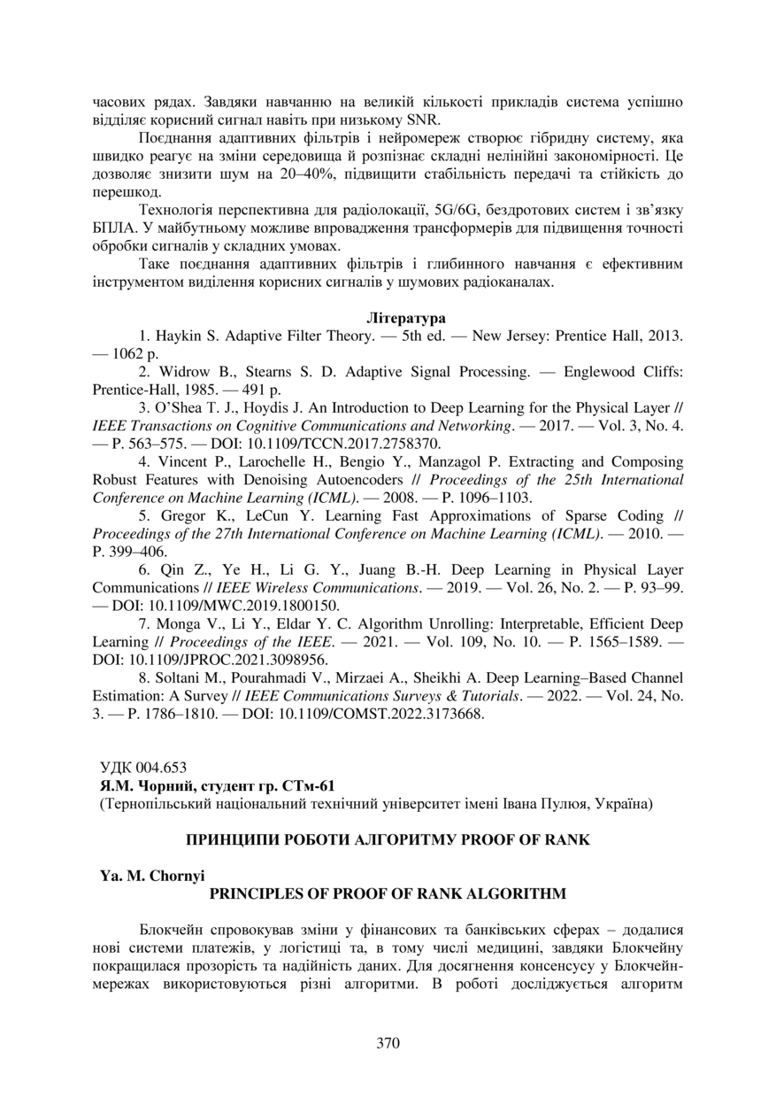 | Bibliographic citation (CHICAGO): | Chornyi Ya. M. (2025) Printsipi roboti alhoritmu Proof of Rank [Principles of Proof of Rank algorithm]. Proceedings of the ⅩⅣ International Scientific and Technical Conference of Young Scientists and Students “Current Issues of Modern Technologies” (Tern., 11-12 December 2025), pp. 370-372 [in Ukrainian]. |
