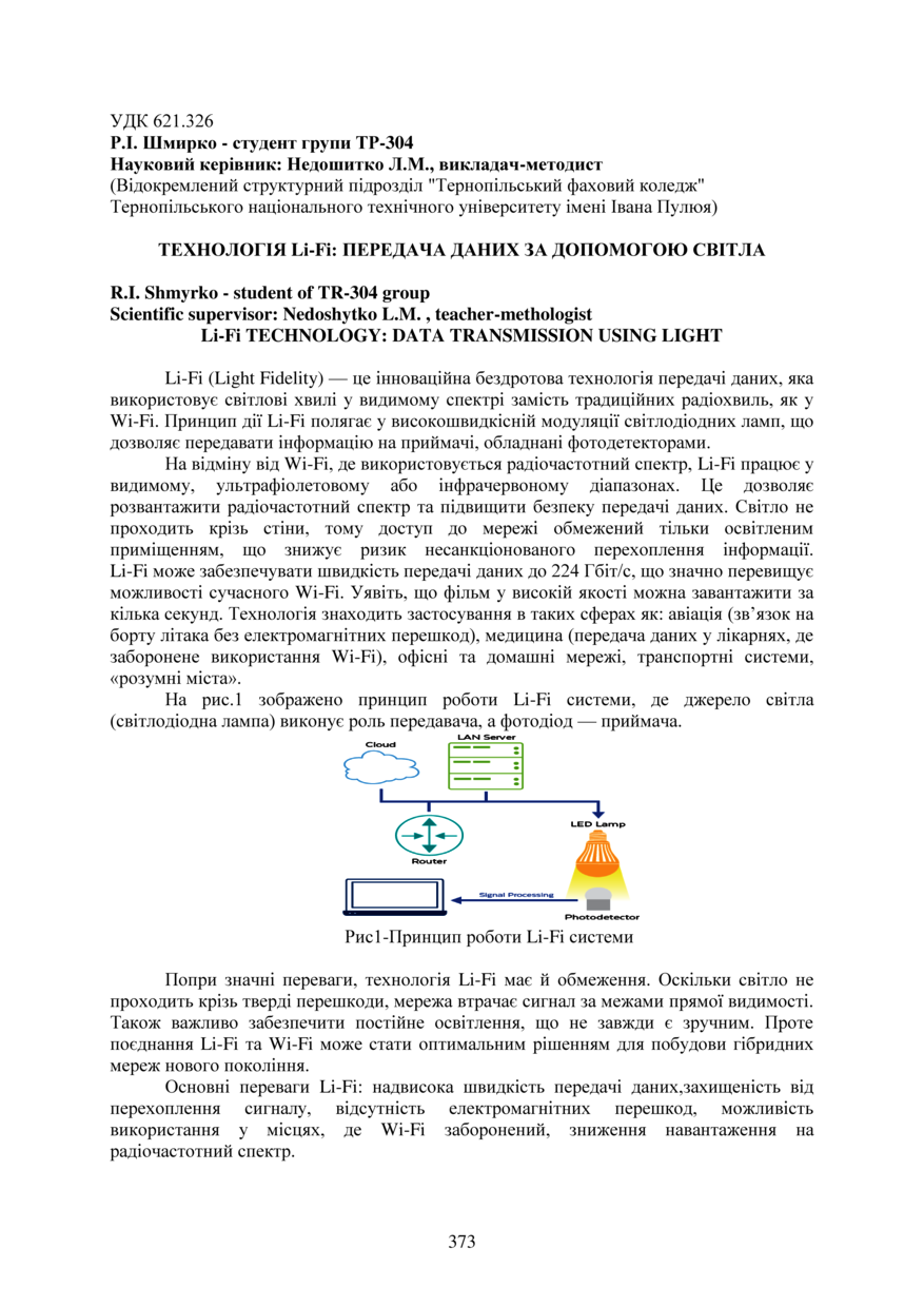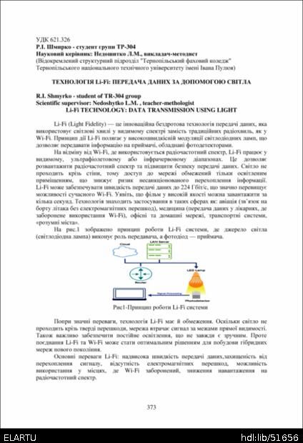 | Bibliographic citation (APA): | Shmyrko, R. I. (2025). Tekhnolohiia Li-Fi: peredacha danykh za dopomohoiu svitla [Li-Fi technology: data transmission using light]. Proceedings of the ⅩⅣ International Scientific and Technical Conference of Young Scientists and Students “Current Issues of Modern Technologies”, 11-12 December 2025, Ternopil, 373-374. PE Palianytsia V.A.. [in Ukrainian]. |