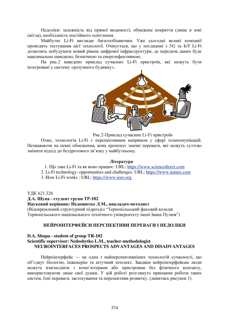 | Bibliographic citation (APA): | Shupa, D. A. (2025). Neirointerfeisy perspektyvy perevahy i nedoliky [Neurointerfaces prospects advantages and disadvantages]. Proceedings of the ⅩⅣ International Scientific and Technical Conference of Young Scientists and Students “Current Issues of Modern Technologies”, 11-12 December 2025, Ternopil, 374-376. PE Palianytsia V.A.. [in Ukrainian]. |